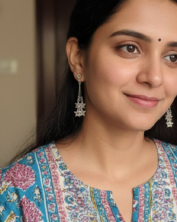 Product Overview: Apne style mein thodi "Star Magic" add karein in Celestial Star Drop Earrings ke saath. Inka sleek aur modern design un logon ke liye perfect hai jo minimalist magar eye-catching jewellery pasand karte hain. Yeh earrings aapke har move ke saath khubsurti se swing karti hain.