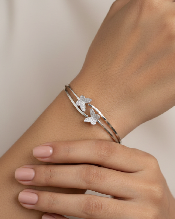 Yeh bracelet sirf ek accessory nahi, balki ek kahani hai. Isme do khoobsurat butterflies ko ek elegant curve mein design kiya gaya hai jo aisa lagta hai maano wo hawa mein udd rahi hon. Iska hammered-finish silver band aur shining zirconia stones ise har roshni mein chamakne ka mauka dete hain.
