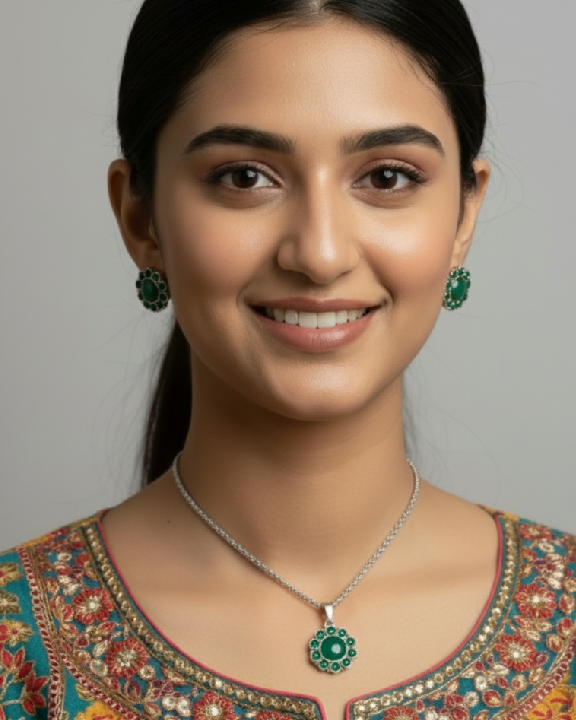 Vibrant Emerald Tones: Is pendant aur earrings mein deep green stones hain jo ek 'earthy' aur royal look dete hain.